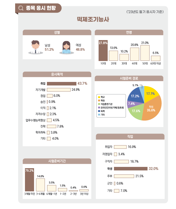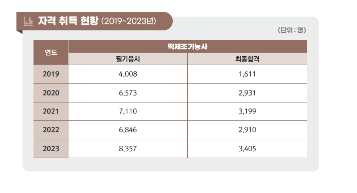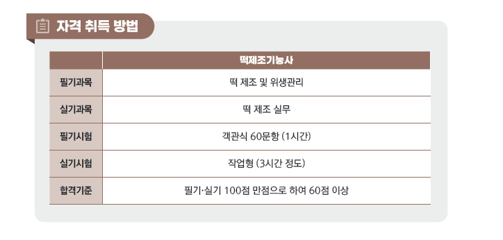 ● 곡류, 두류, 과채류 등과 같은 재료를 이용하여 식품위생과 개인안전관리에 유의하여 빻기, 찌기, 발효, 지지기, 치기, 삶기 등의 공정으 ㄹ겨쳐 각종 떡류를 만드는 직무이다.