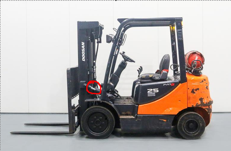 아래 사진의 붉은색 부부이 지게차의 실린더인데, 보통 남자 손바닥 정도가 옆으로 들어갈 정도면 포크가 어느정도 수평에 맞는듯하다. 상하차시 실린더 부분이 남자 손바닥 정도나 혹은 조금 더 벌어진 경우에는 하차에 크게 문제가 없는데, 실린더 부분이 그 보다 더 좁혀져 있다면, 하차시 포크의 끝부분이 파레트를 치켜 올려지는 경우가 많았다.