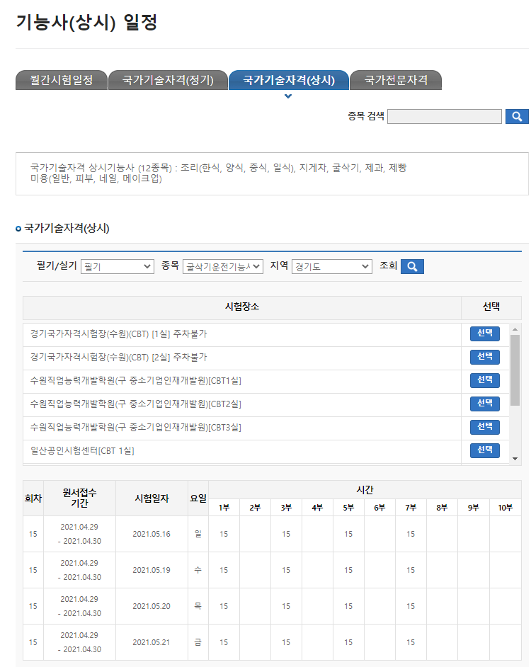 굴삭기 운전기능사 필기시험 회차별 지역 상세일정 확인