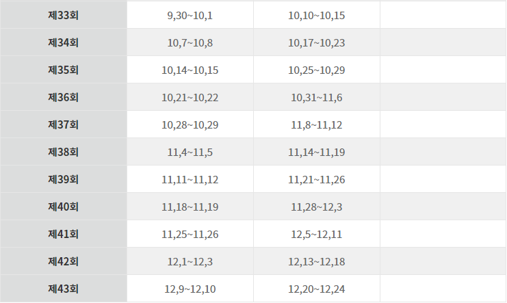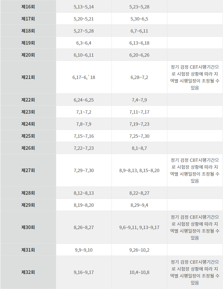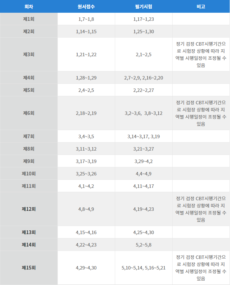 회차별 기간에 지역별로 일정이 상이하므로 전체적인 일정에 참조하시고 정확한 시험 일정을 아래 안내드리는 Q-Net 사이트에서 각 회차에 해당하는 일정을 보실 수 있겠습니다.