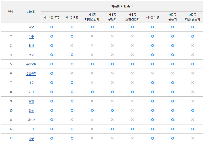 1,2종 보통 면허는 모든 시험장소에서 가능하지만, 1종 대형 및 1종 대현견인, 구난차 등 특수면허는 시험이 가능한 운전면허 시험장소가 따로 지정되어 있습니다.