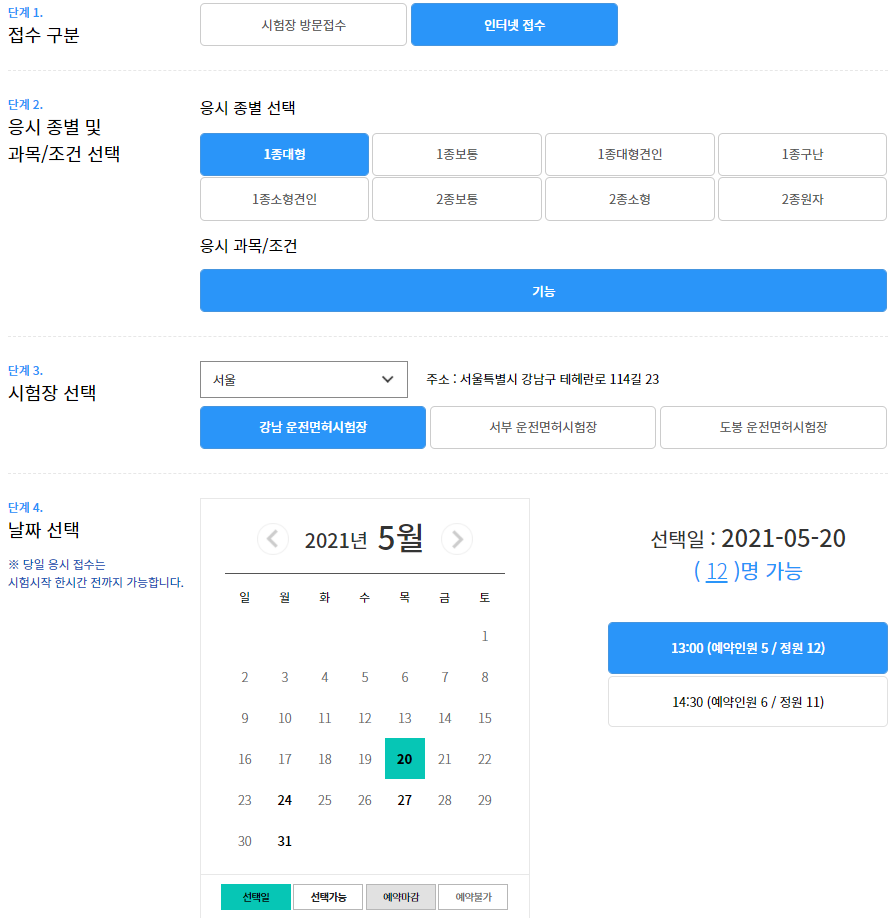 확인해 보니, 각 시험장은 매달 시험 일정을 올리는 시기가 있는데, 예를들어 서울 강남 시험장은 매달 7,8일 정도가 되어야 다음달 시험일정을 올리고 있습니다. 그래서 일정이 빨리 차는 1종대형견인의 경우, 매달 8일 전에 시험을 보고 혹 불학격되어도 다음달 일정을 바로 잡을 수도 있는데, 20일 정도 시험을 보고 불합격되었다면 다음달에는 모두 예약되었을 가능성이 높고 다다음달에나 예약이 가능하게 됩니다. 빨리 시험을 마무리 하고 싶은데 가까운 일정이 없다면 답답합니다.