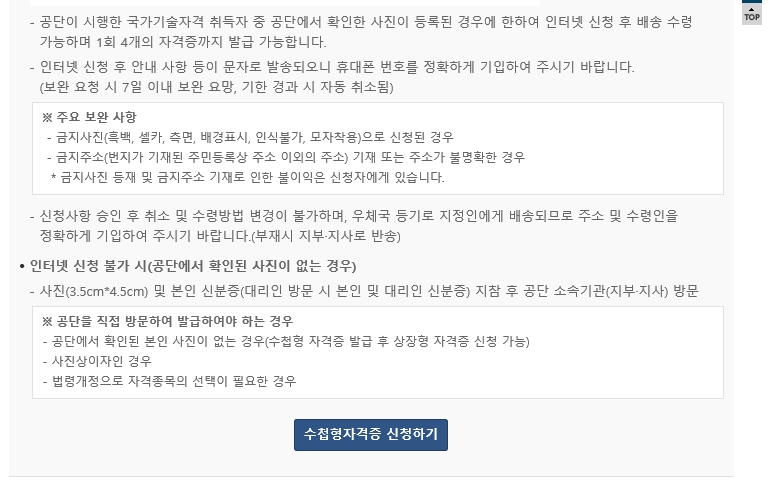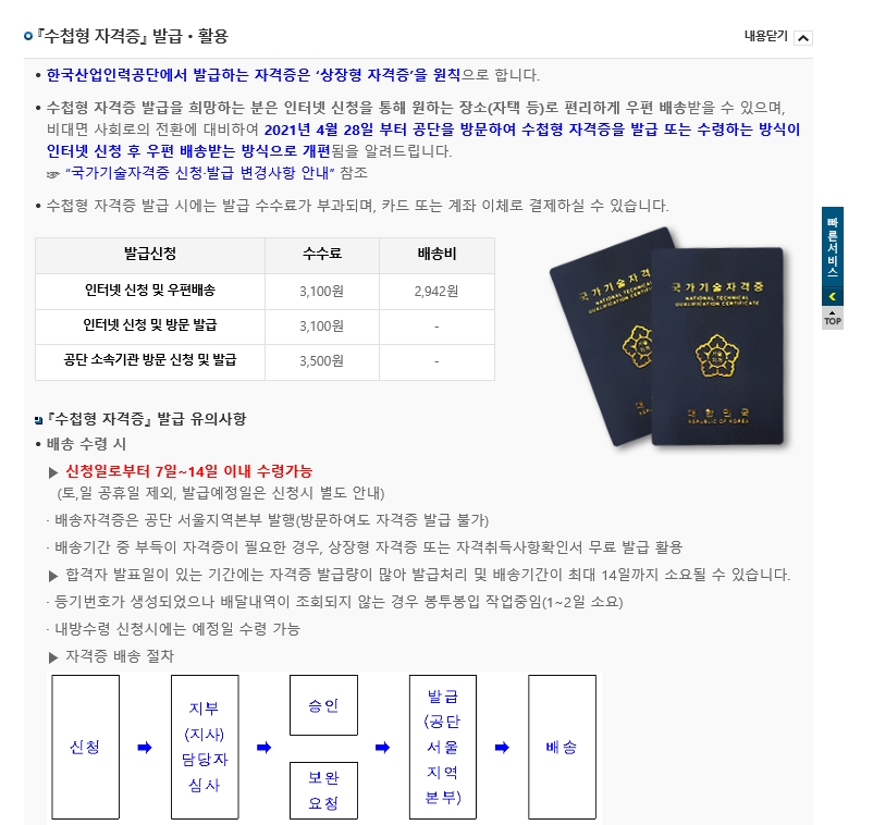 그런데, 수첩형 자격증을 갖는게 평소 로망이었던 처라 수첩형을 신청하기로 했다. 수첩형은 신청 후 직접 공단에 가서 받을 수도 있고 택배를 통해서 원하는 장소에서 받을 수도 있다. 코로나 시대라 택배로 받도록 신청했다.