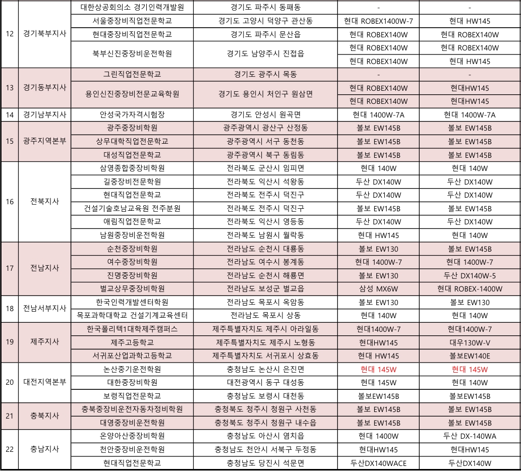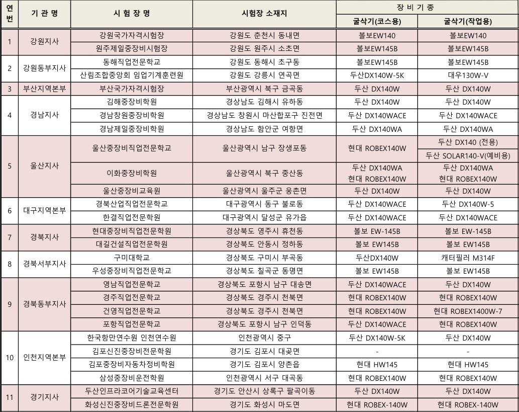 아래표는 시험장 소재지와 굴삭기 장비기종 표입니다.
