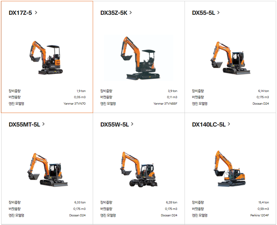 굴삭기 크기별로 나와 있는데.. 두산중공업에서는 현재 16종의 굴삭기를 판매하네요.