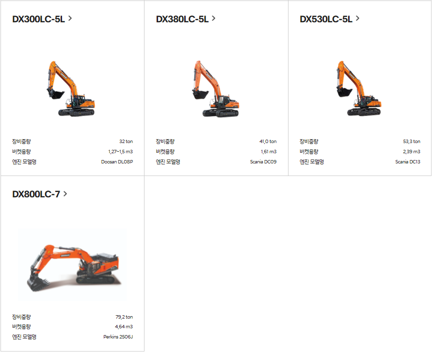 두산중공업에서 현재 생산되는 굴삭기를 체크해 봤는데, 재미있는 사실을 몇개 발견하게 되었습니다.