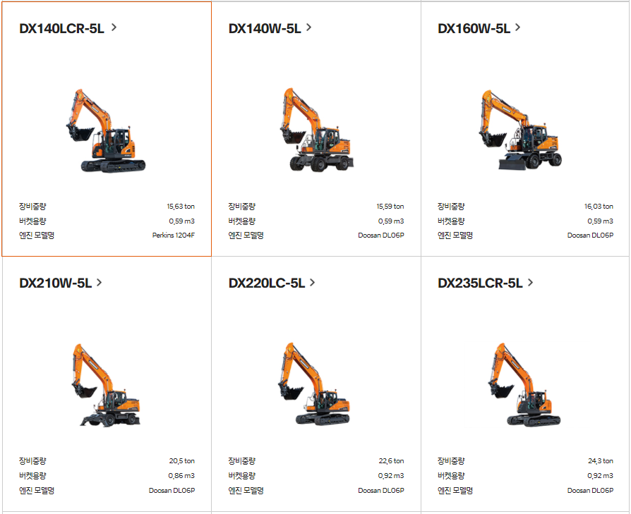 굴삭기 크기별로 나와 있는데.. 두산중공업에서는 현재 16종의 굴삭기를 판매하네요.