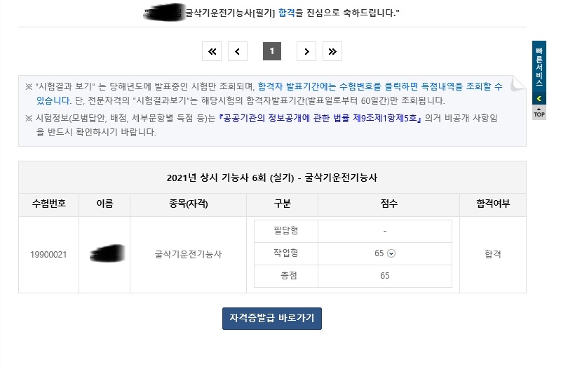 합격을 하면, 몇 점으로 합격했는지 확인할 수가 있는데, 간당간당하게 65점이다. 굴삭기는 S자 주행 25점 만점, 그리고, 굴삭 작업 75점, 총 100점이 만점이다. 100점 만점에 60점 이상이면 합격이니, 떨어질 뻔 한것 같다. 학원에 다닌분들이 아니면 그 점수도 괜찮은 점수라고 하는데, 합격한 것 만으로도 기분은 좋다.