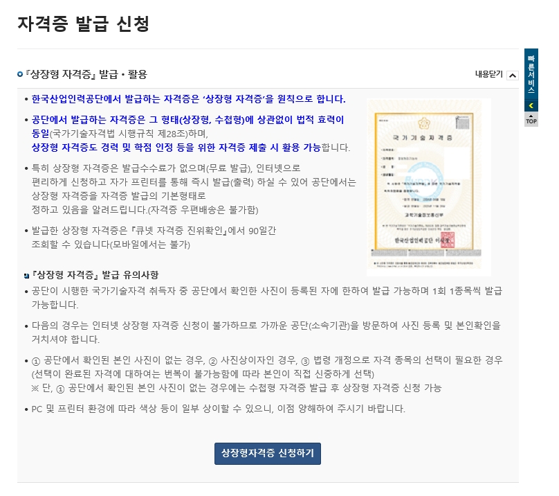 그리고, 자격증 신청에 들어갔는데, 아래와 같이 자격증은 상장형 자격증과 수첩형 자격증 두종류가 있다고 한다. 가능하면 한국산업인력공단에서는 상장형 자격증을 원칙으로 한다고 한다.