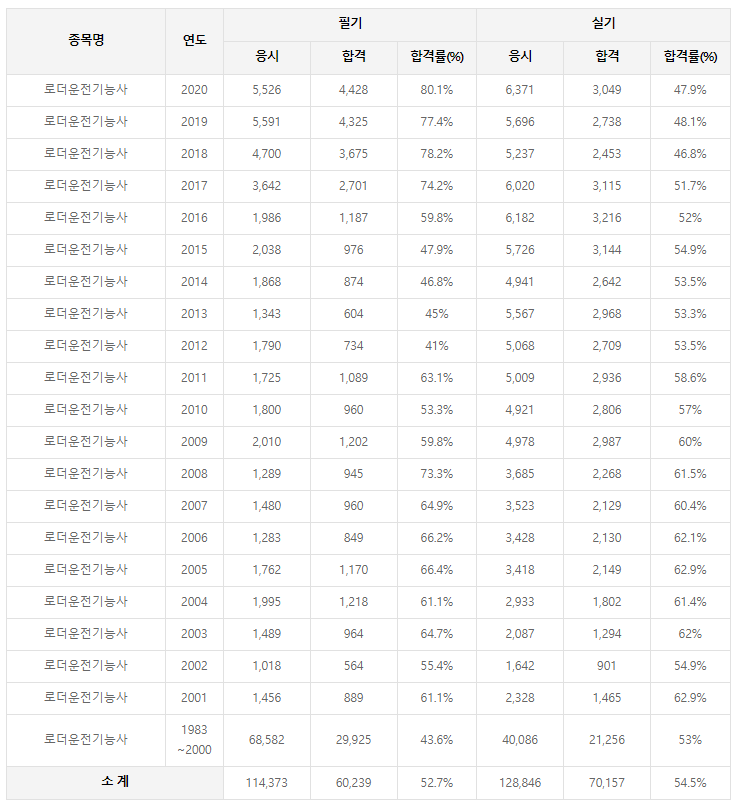 로더운전기능사 연도별 합격률