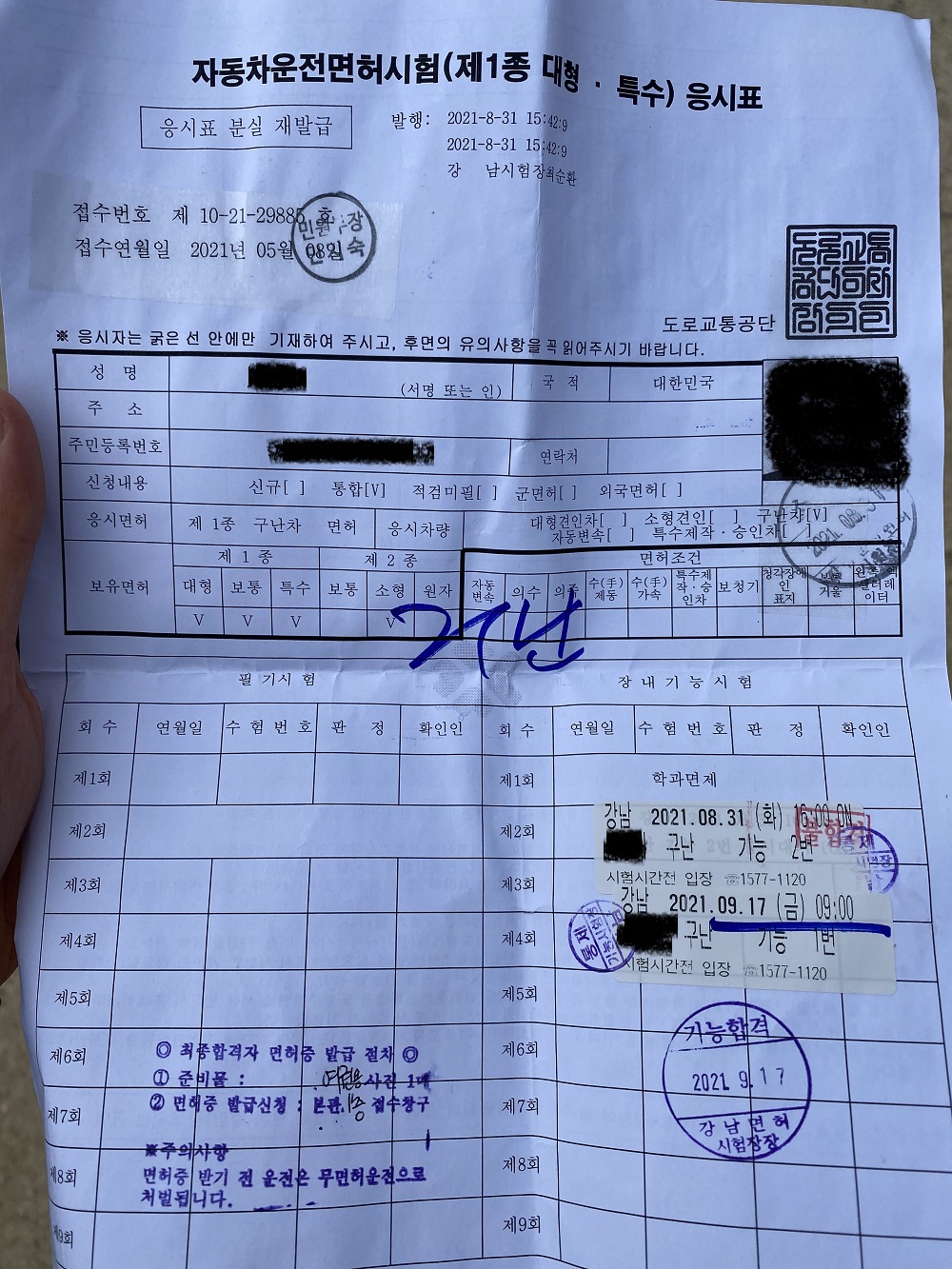 강남 시험장에서 합격하고 나오면서 수험표 찍어 봤습니다. 지난번 한번 수험표를 잃어버려서 두번째 합격처럼 보이는데, 구난차는 몇번 시험을 더 봤습니다ㅠ 만만하게 보면 큰일 날 시험 ㅠ, 더구나 한번 탈선해도 90점으로 합격이 가능하지만, 정확한 공식을 알지 못하면 쉽지 않은 시험입니다.