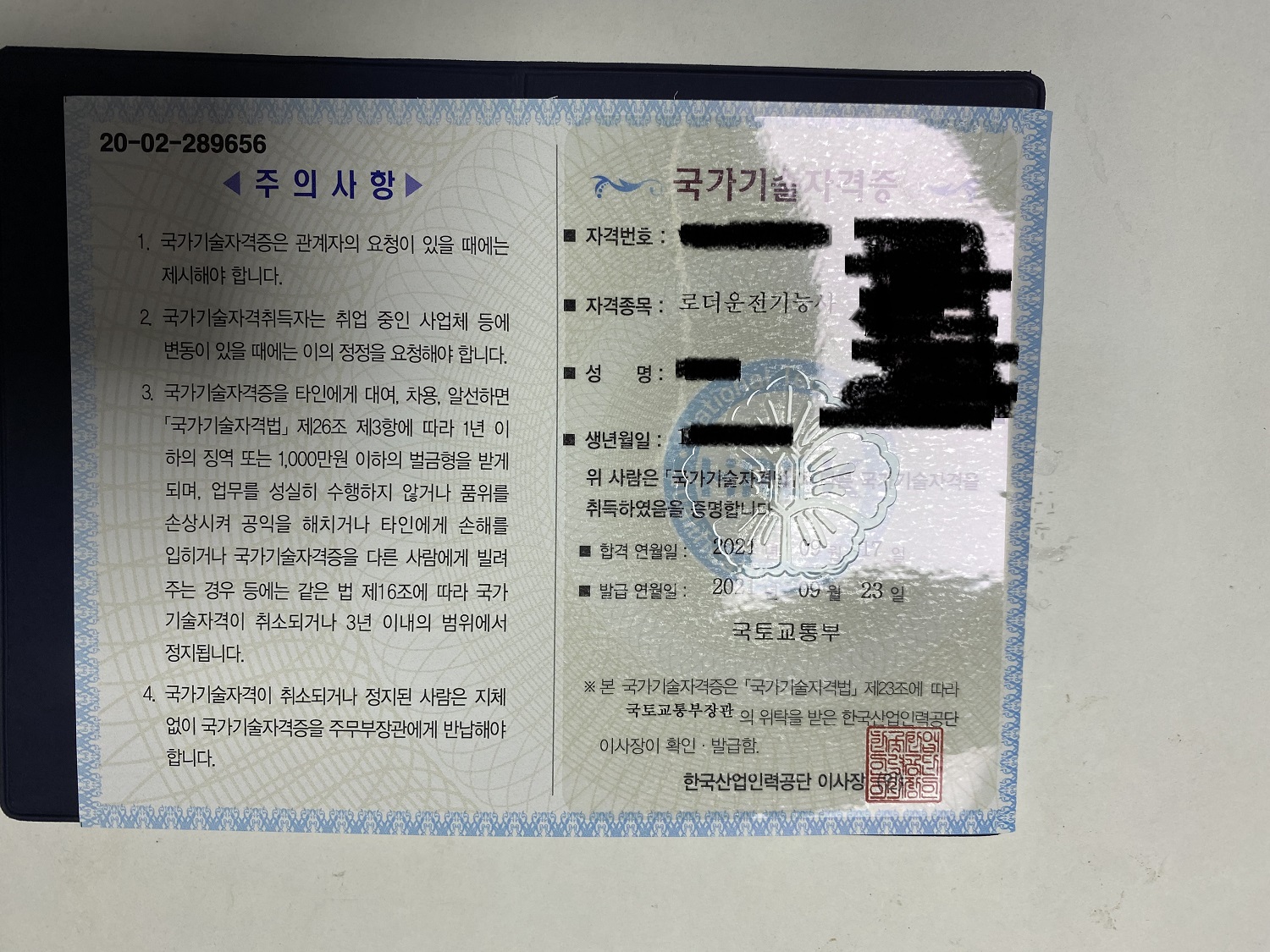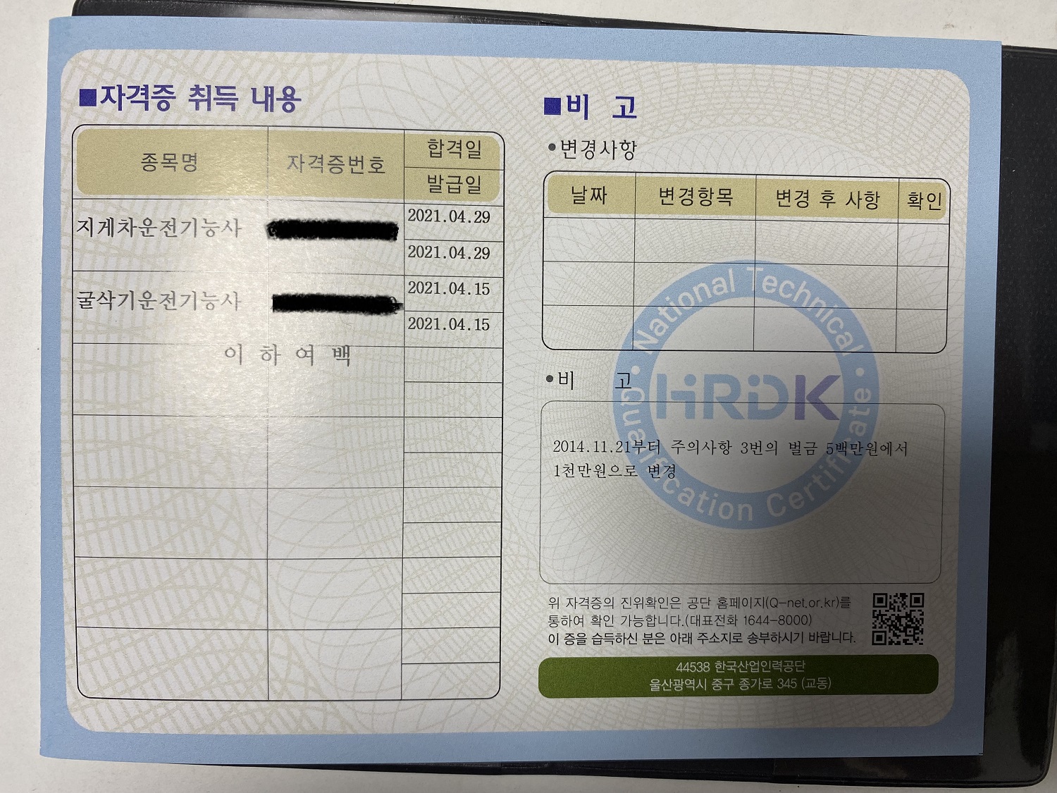 자격증 뒷면에는 올해 4월에 발급받은 지게차와 굴삭기운전기능사도 같이 표기되어 있습니다.