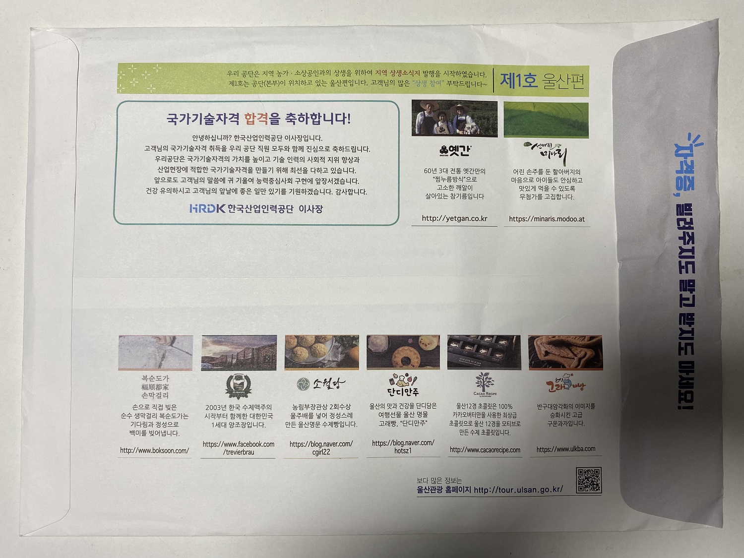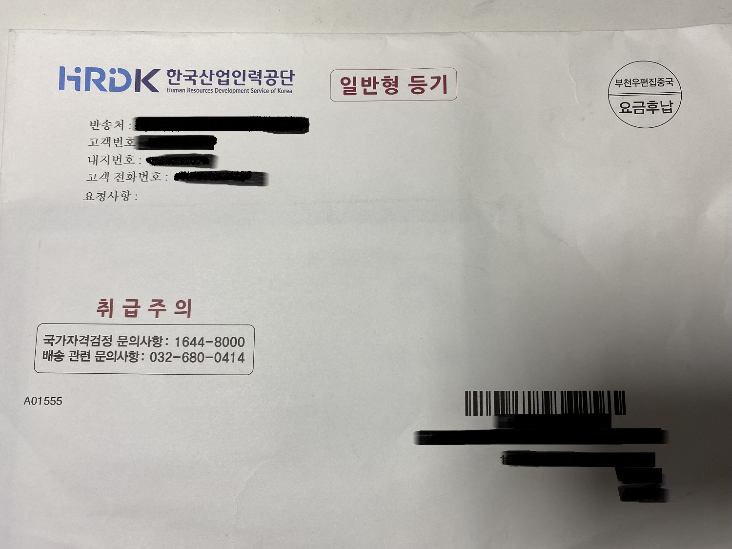 자격증은 위와 같은 봉투에 등기를 통해서 배달됩니다.