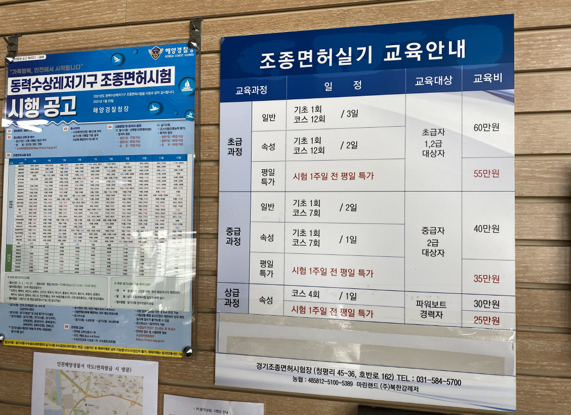 시험번호 8번이라, 구명자켓을 입고 다른분 시험 볼때.. 시험장 사무실 내부의 게시판의 내용을 찍어보았다.