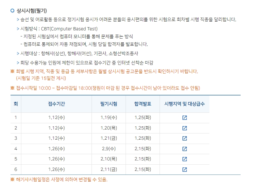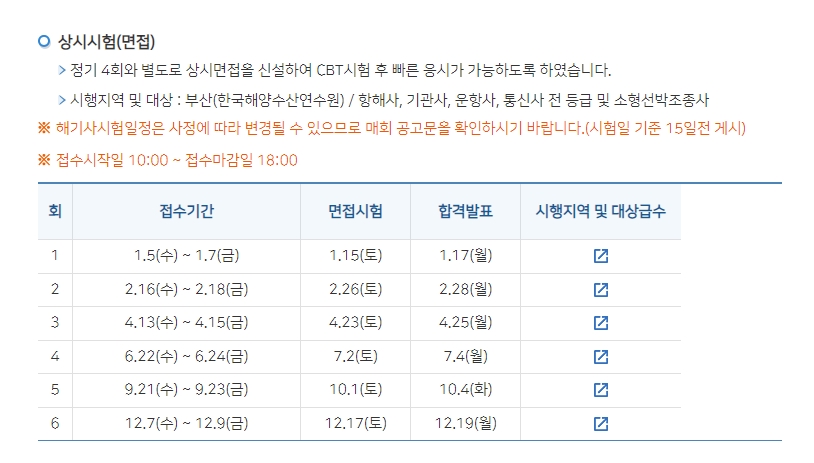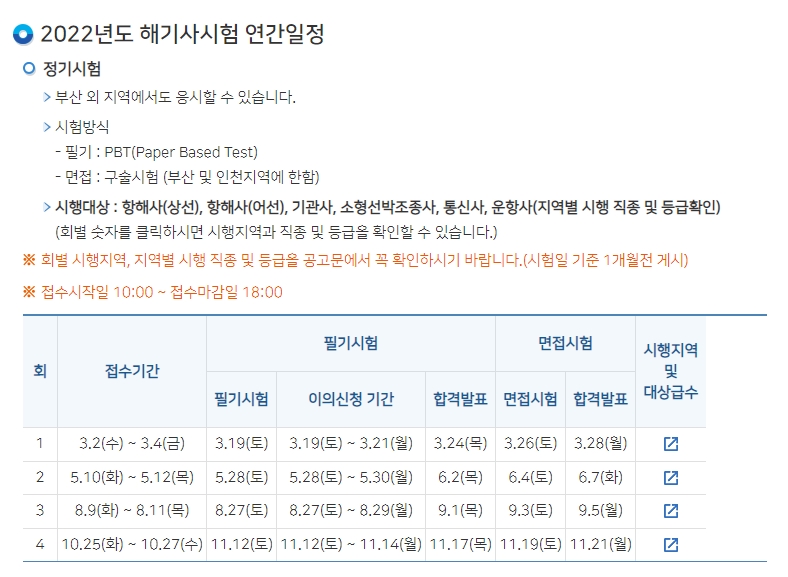연간시험일정표 2022년도 해기사시험 연간일정 정기시험 부산 외 지역에서도 응시할 수 있습니다. 시험방식 - 필기 : PBT(Paper Based Test) - 면접 : 구술시험 (부산 및 인천지역에 한함) 시행대상 : 항