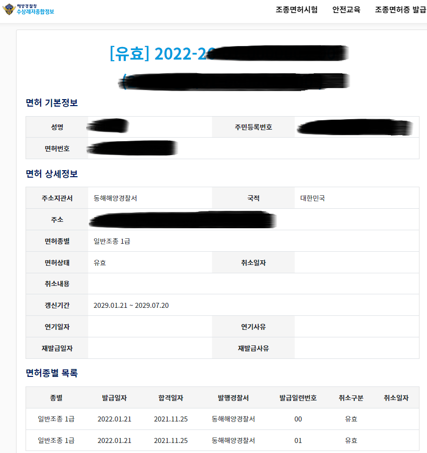 보트조종면허와 요트면허 필기시험을 처음 본 이후 1년여 만에 실물 면허증을 받게 되어 포스팅을 해 봅니다.