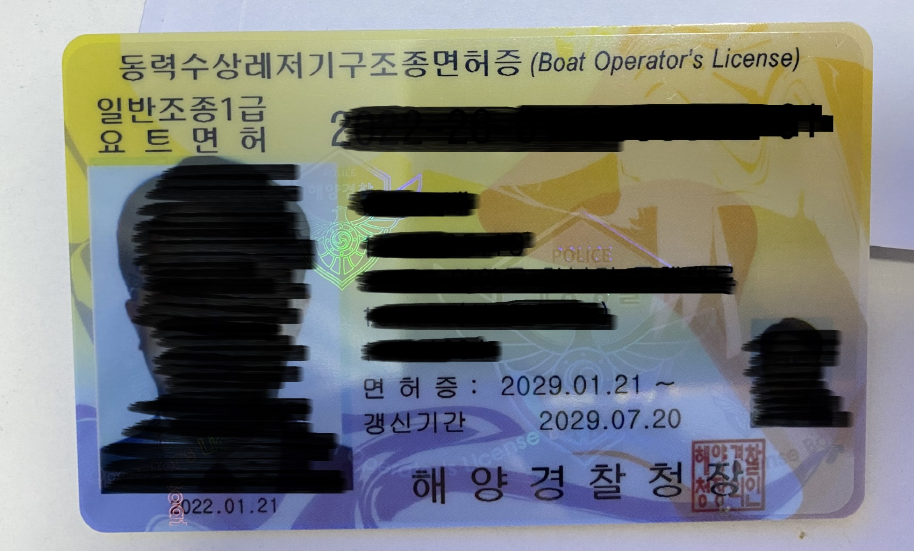 좌측상단에 면허증 (일반조종1급 과 요트 면허)라고 적혀있고, 운전면허증과 비슷하게 생겼네요.