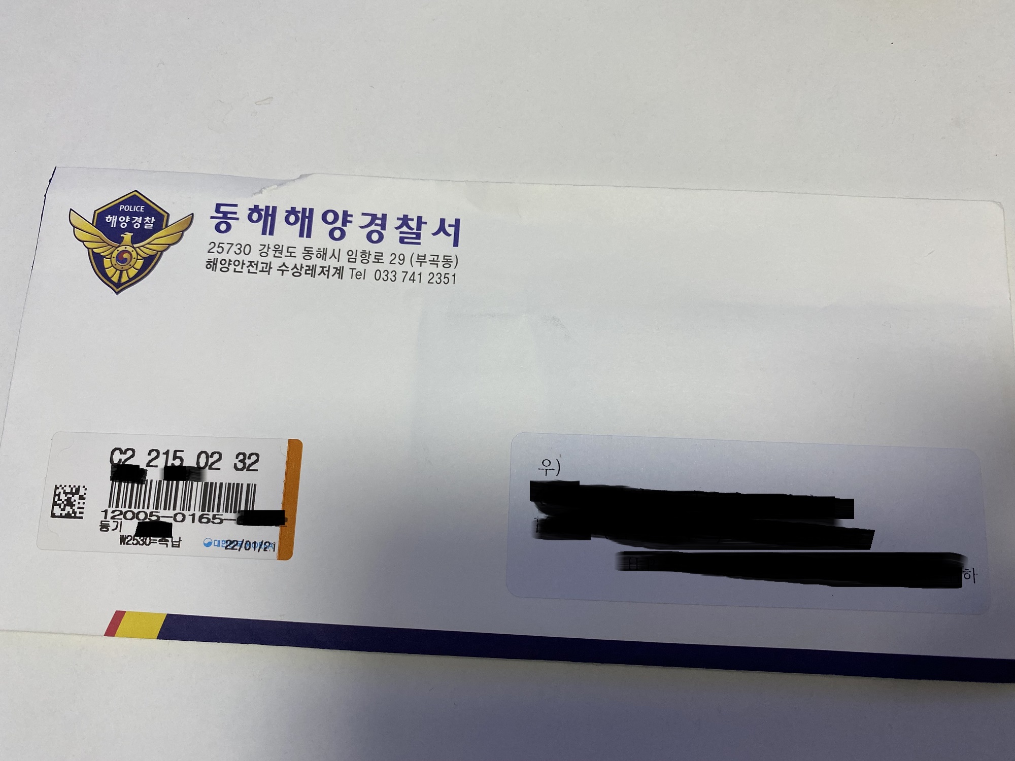 동해해양경찰서에서 발급해서 보내줬네요.