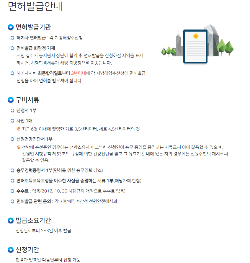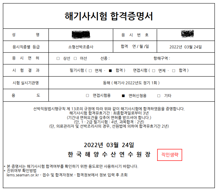 소형선박조종사도 합격 후 면허증을 반드시 발급받아야 합니다. 기간은 합격일로 부터 3년 이내에 지방해야수산청에서 받아야 하네요.