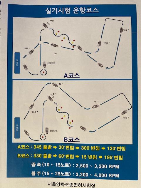 보트와 요트 필기는 합격했으니, 이제 실기를 준비해야 하겠네요. 필기합격한지 5개월이 되었는데, 아직 실기 준비는 하고 있지 못하네요. 보트 조종면허 실기 코스는 아래와 같네요. 시험 장소에 있던 자료가 있어서 참고로 올립니다.