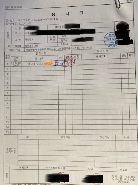 - 준비물: 사진 3.5*4.5 사이즈 1매(최근 6개월이내), 신분증, 응시료 4,800(현금 및 신용카드)