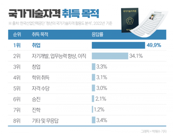 채용됐다고 답했습니다. 자격증 취득 목적 1위인 취업이