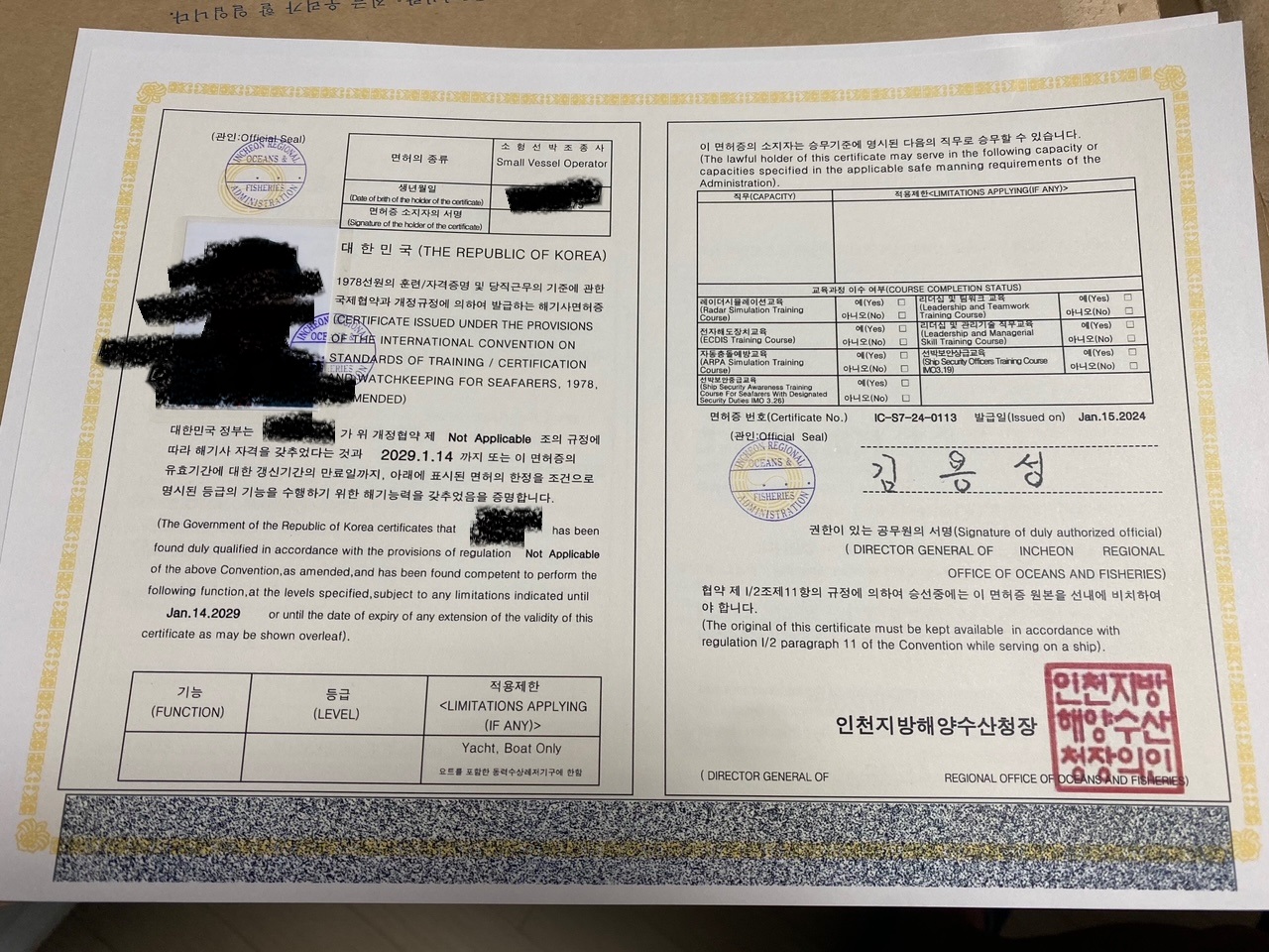 며칠전 인천해양수산청에서 소형선박조종면허와 한정소형선박조종면허를 발급받았습니다.