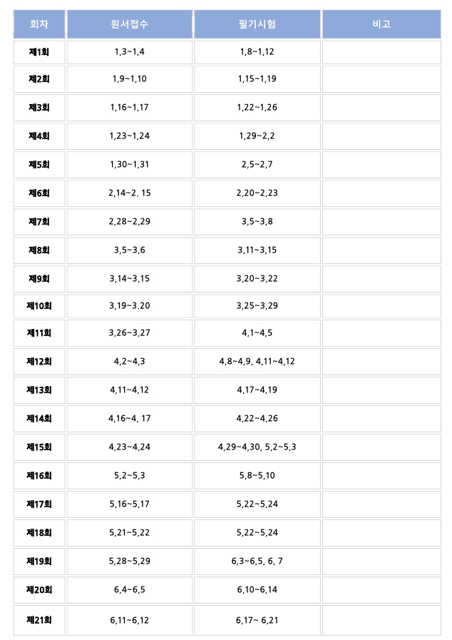 시험은 월요일부터 금요일까지 주중 시행을 원칙으로 하며, 상시시험이기 때문에 상황에 따라 시행일정이 변경될 수 있으니, 접수하실 때 꼭 확인이 필요합니다.