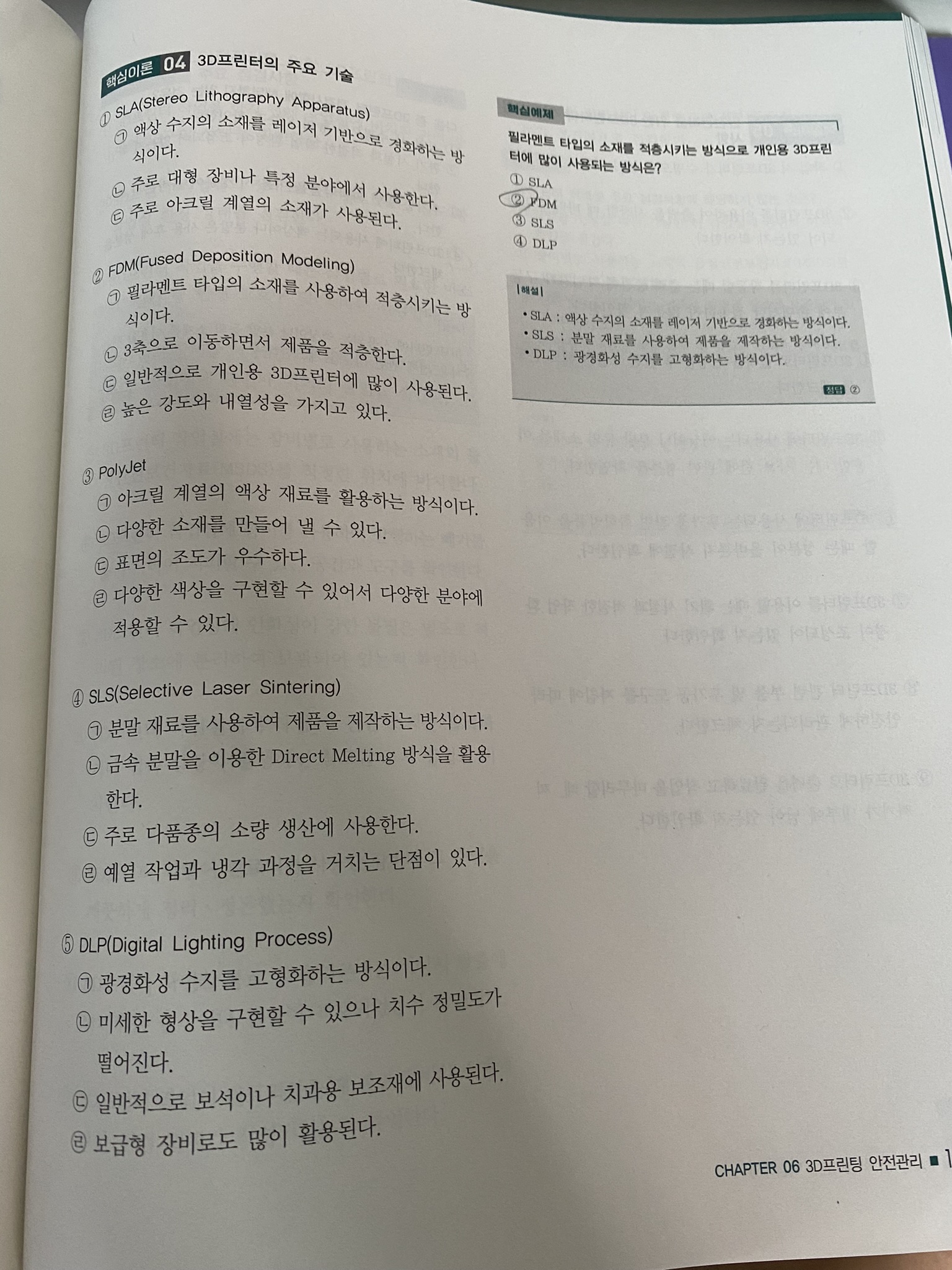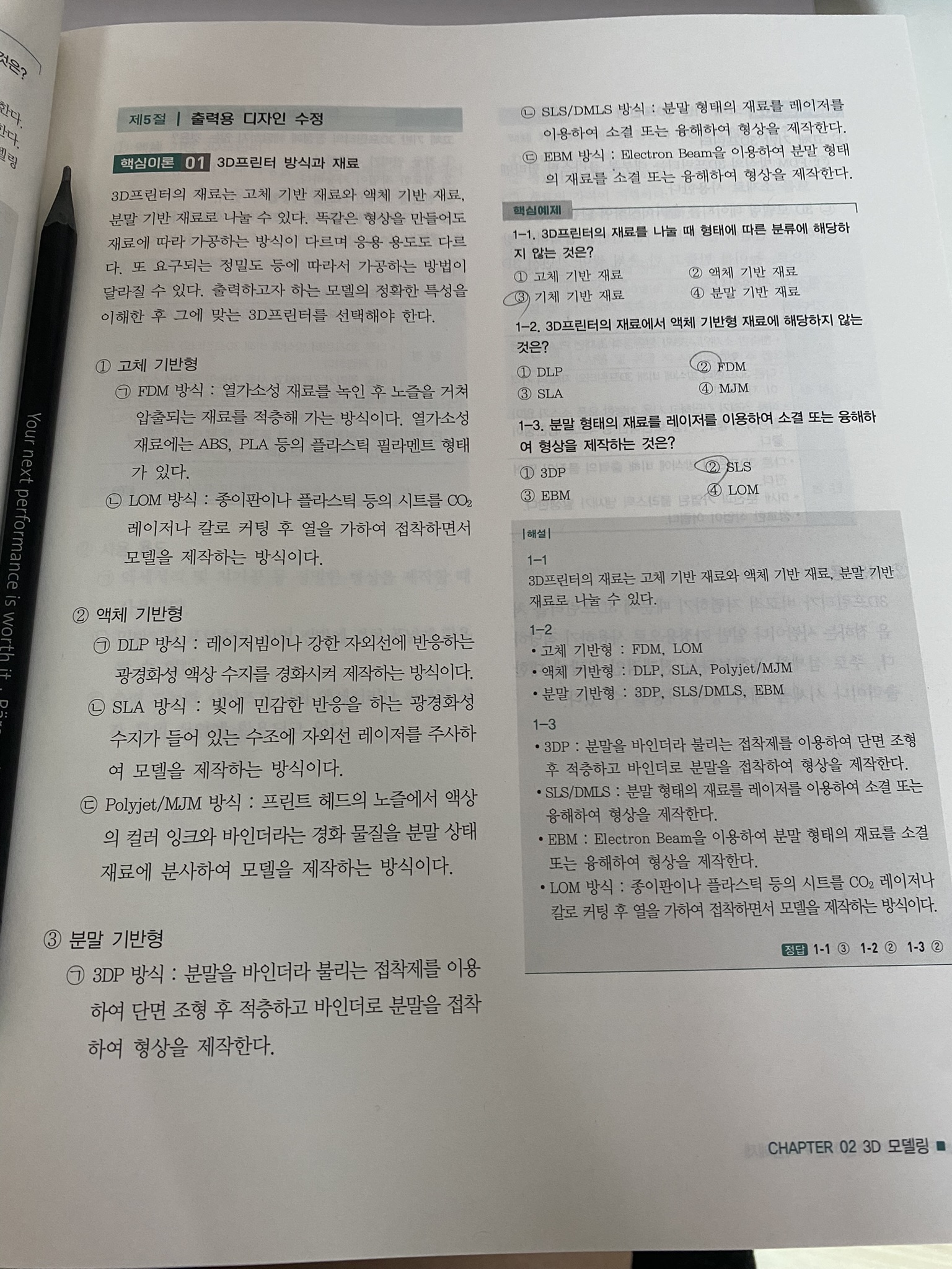 처음 접해 보는 분야라 처음에 약 1주일 동안은 핵심이론과 핵심예제의 내용을 6-7 단원으로 나눠서 하루에 한 단원씩 봤습니다. 그렇게 3D프린터운용기능사의 대략적인 필기 시험 유형을 파악하였습니다.