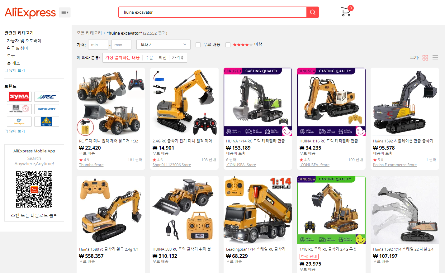 검색창에 Huina 혹은 Huina Exccavator로 검색하면 Huina 회사에서 생산하는 여러종류의 굴삭기 RC가 나옵니다.