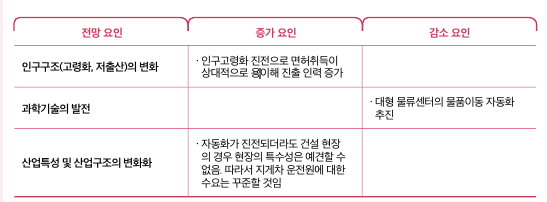 이상과 같이 과학기술의 발전으로 인한 대형 물류센터의 물품이동장치 자동화 증가와 같은 부정적인 요인과 인구고령화 진전으로 이·전직이 상대적으로 용이한 측면과 건설 현장의 특수성으로 인한 지게차운전원 수요 증가와 같은 긍정적인 요인으로 인하여 지게차운전원의 일자리는 향후 10년간 현 상태를 유지할 것으로 전망된다.